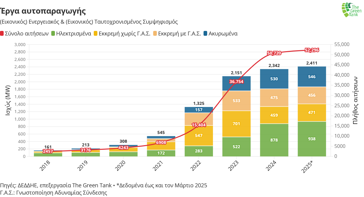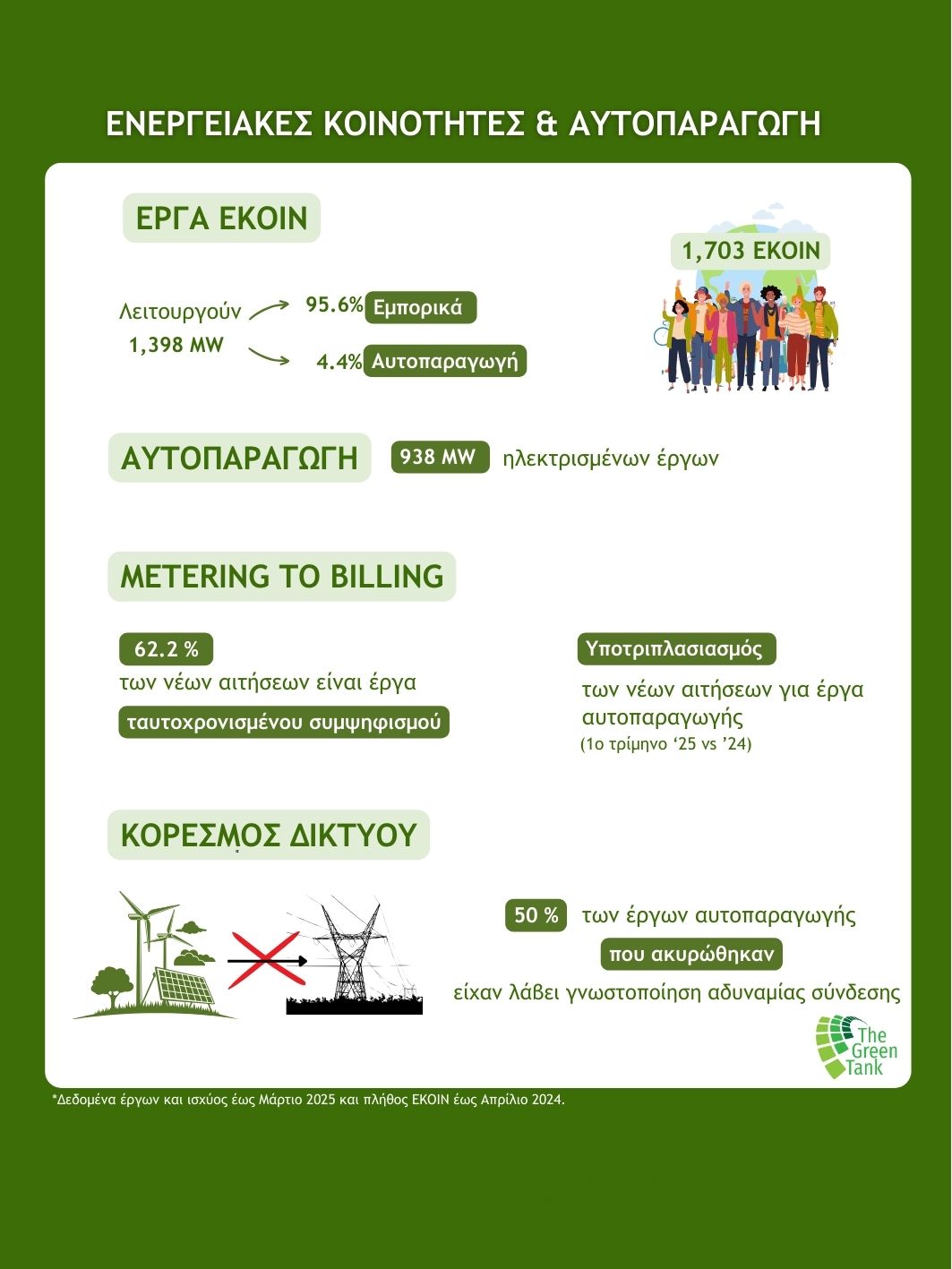 - Οι θεσμικές αλλαγές στην αυτοπαραγωγή επιβράδυναν την πορεία των αιτήσεων: Μετά το «άλμα» του 2023 όπου κατατέθηκαν 21,350 νέες αιτήσεις έργων αυτοπαραγωγής, οι νέες αιτήσεις το 2024 περιορίστηκαν στις 13,966, ενώ το πρώτο τρίμηνο του 2025 υποβλήθηκαν μόνο 1,576 νέες αιτήσεις.