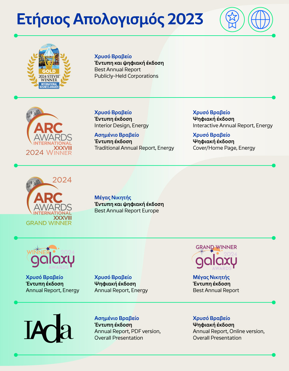 Σημαντικές οι φετινές διακρίσεις σε διεθνείς διαγωνισμούς για τον Ετήσιο Απολογισμό της HELLENiQ ENERGY για το 2023, ο οποίος κατέκτησε 9 βραβεία ως «Καλύτερος Ετήσιος Απολογισμός», καθώς και, για πρώτη φορά, τη διάκριση «Μέγας Νικητής – Καλύτερος Ετήσιος Απολογισμός, Ευρώπη*».