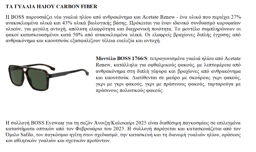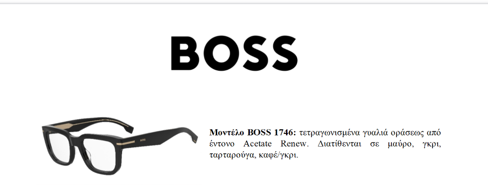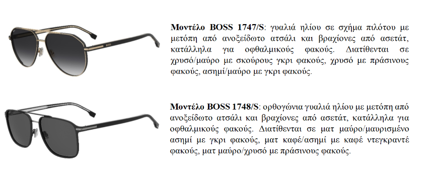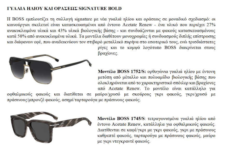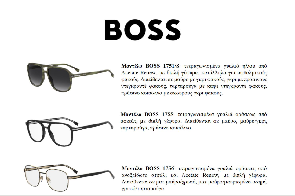 Τα μοντέλα συμπληρώνουν οι φακοί από ανακυκλωμένα υλικά. Τα μοντέλα της σειράς ξεχωρίζουν με τα χαρακτηριστικά μεταλλικά διακοσμητικά και τις εμβληματικές ρίγες της BOSS, τα πολυτελή τους χρώματα και τους συνδυασμούς διπλής επίστρωσης που αποκαλύπτουν τον μεταλλικό τους πυρήνα, ολοκληρώνοντας τη μοντέρνα τους εμφάνιση.