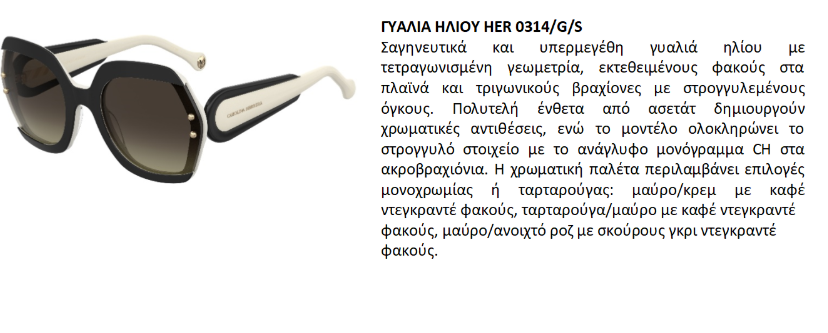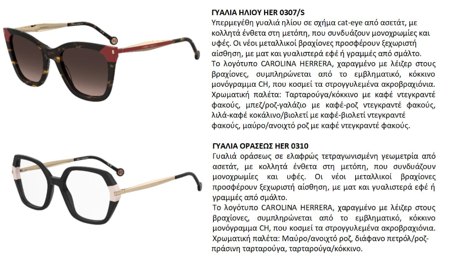 Αυτή τη σεζόν, η εμβληματική σειρά HOUSE OF HERRERA περνάει στο επόμενο επίπεδο: τα νέα μοντέρνα, αριστοκρατικά γυναικεία γυαλιά ηλίου και οράσεως ενισχύονται με στρογγυλεμένους όγκους, χαρίζοντας αβίαστο στιλ. Τα νέα μοντέλα διαθέτουν μοναδικούς συνδυασμούς χρωματικών αντιθέσεων στους βραχίονες, οι οποίοι καταλήγουν σε ένα στρογγυλό στοιχείο με το μονόγραμμα CH στα ακροβραχιόνια.