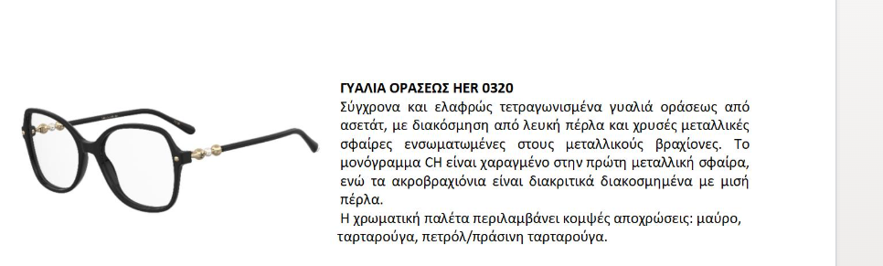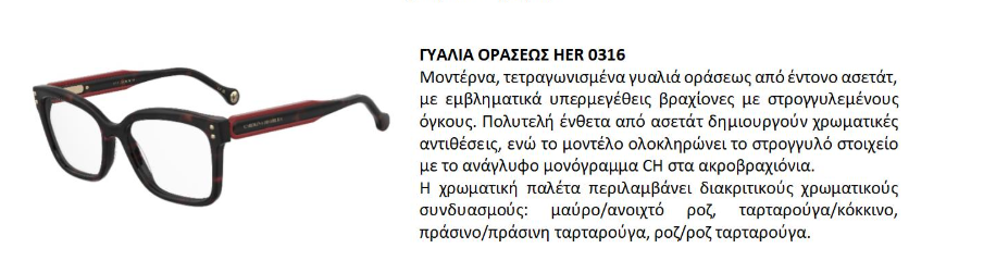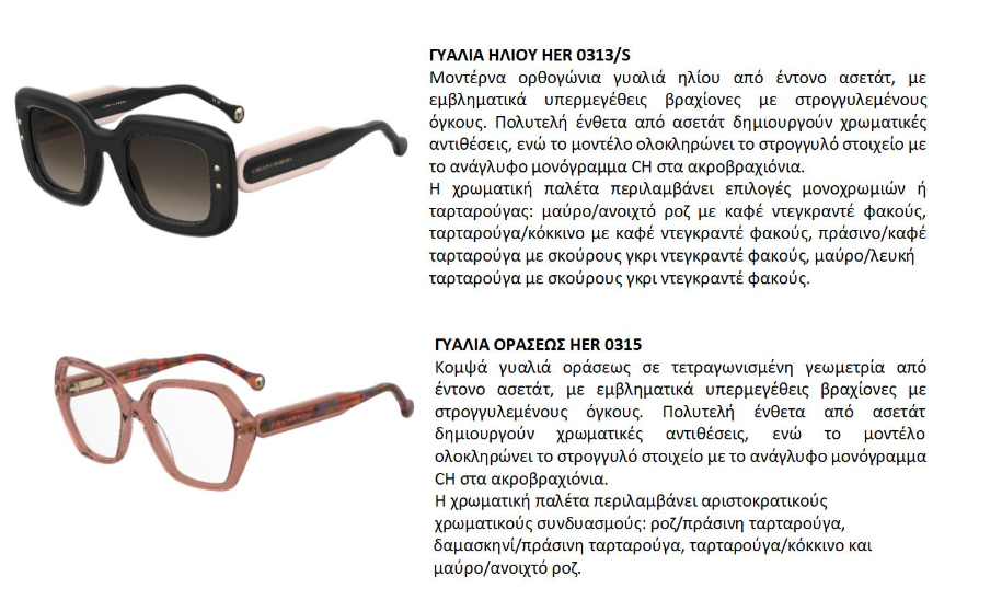 Τα φινετσάτα και σύγχρονα μοντέλα από ελαφρύ ασετάτ είναι διακοσμημένα με κολλητά ένθετα στη μετόπη, ενώ οι νέοι, μπιζουτέ μεταλλικοί βραχίονες προσφέρουν ξεχωριστό ύφος.