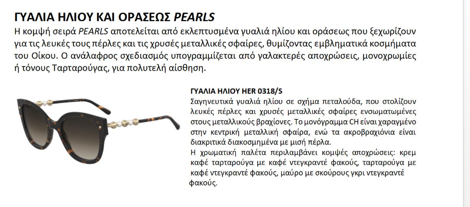 Τα κομψά γυαλιά ηλίου και οράσεως Pearls ξεχωρίζουν για τις λευκές τους πέρλες και τις χρυσές μεταλλικές σφαίρες που θυμίζουν εμβληματικά κοσμήματα του Οίκου και υπογραμμίζονται από γαλακτερές αποχρώσεις, μονοχρωμίες ή τόνους ταρταρούγας, με πολυτελή αίσθηση.