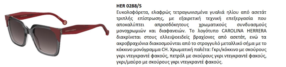 Τα ευκολοφόρετα γυαλιά ηλίου από ασετάτ τριπλής επίστρωσης, διαθέτουν εξαιρετική τεχνική επεξεργασία που αποκαλύπτει απροσδόκητους χρωματικούς συνδυασμούς με μονοχρωμίες και διαφάνειες. Τα μοντέλα ολοκληρώνουν οι ελλειψοειδείς βραχίονες από ασετάτ που διακοσμούνται από το μεταλλικό σήμα με το κόκκινο μονόγραμμα CH.