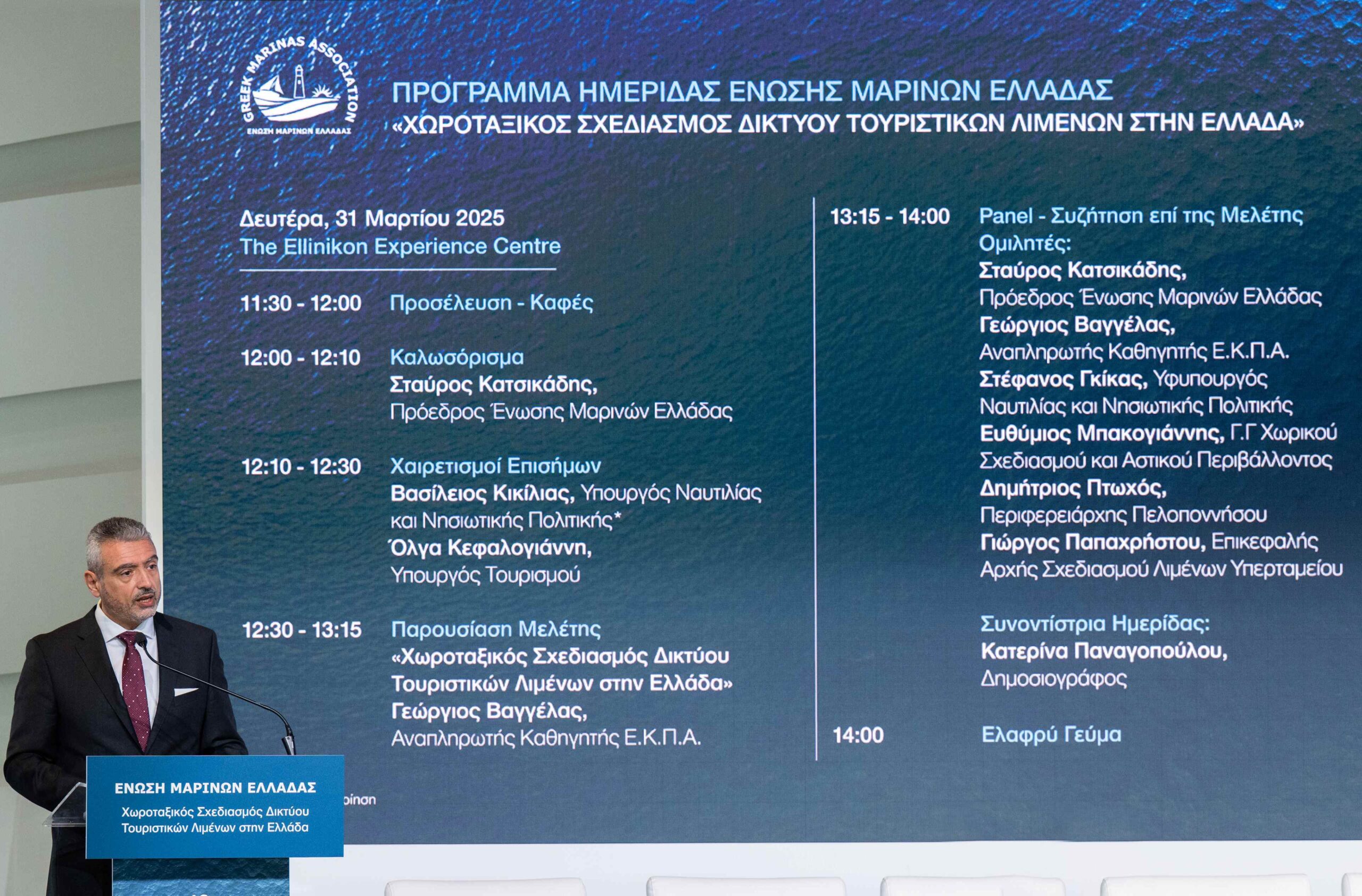 Με θέμα «Χωροταξικός Σχεδιασμός Δικτύου Τουριστικών Λιμένων στην Ελλάδα» πραγματοποιήθηκε την Δευτέρα, 31 Μαρτίου 2025, η ενημερωτική Ημερίδα της Ένωσης Μαρινών Ελλάδος (Ε.ΜΑ.Ε.). Κατά την διάρκεια της Ημερίδας παρουσιάστηκε από τον Αναπληρωτή Καθηγητή στο Τμήμα Διαχείρισης Λιμένων & Ναυτιλίας του Εθνικού και Καποδιστριακό Πανεπιστήμιο Αθηνών κ. Γεώργιο Κ. Βαγγέλα η μελέτη* με τίτλο «Προτάσεις για την Ανάπτυξη Δικτύου Τουριστικών Λιμένων στην Ελλάδα». Την μελέτη συνυπογράφει ο καθηγητής στο Τμήμα Ναυτιλιακών Σπουδών του Πανεπιστήμιο Πειραιώς κ. Θάνος Πάλλης, κατόπιν πρωτοβουλίας και χρηματοδότησης της Ένωσης Μαρινών Ελλάδας (Ε.ΜΑ.Ε.) με τη σύμφωνη γνώμη και τη θετική ανταπόκριση του Υπουργείου Τουρισμού.