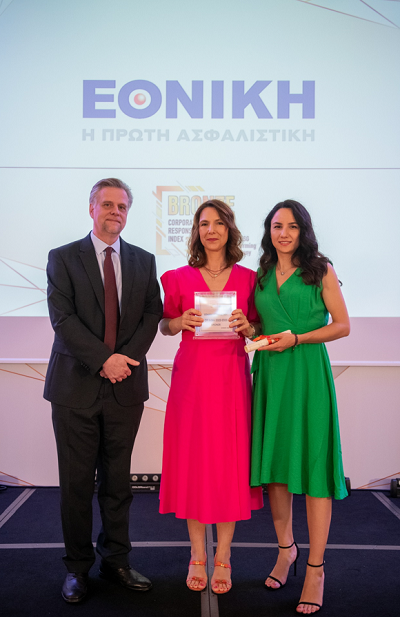 Ειδικότερα, η Εθνική Ασφαλιστική απέσπασε – για τέταρτη συνεχόμενη χρονιά – την Bronze διάκριση για το «υπεύθυνο επιχειρείν», στο πλαίσιο της αξιολόγησης «CR Index 2022-2023», που διενήργησε για 15η χρονιά το Ινστιτούτο Εταιρικής Ευθύνης. Το βραβείο παρέλαβαν, από τον κ. Eric Soderquist, Director του MBA International Program στο Οικονομικό Πανεπιστήμιο Αθηνών, οι κ.κ. Νατάσσα Μαυραγάνη, Ασπασία Σιγάλα, Υπεύθυνη Δημοσίων Σχέσεων και συνεργάτης Τομέα Δημοσίων Σχέσεων, αντίστοιχα.