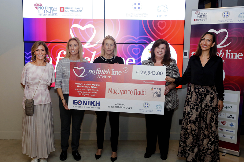 Στην Ένωση «Μαζί για το Παιδί» παραδόθηκε η επιταγή των 29.543 ευρώ που συγκεντρώθηκαν από τα χιλιόμετρα που κάλυψαν οι χιλιάδες δρομείς που συμμετείχαν στο 7ο No Finish Line Athens, τον Μάϊο, στο ΟΑΚΑ.