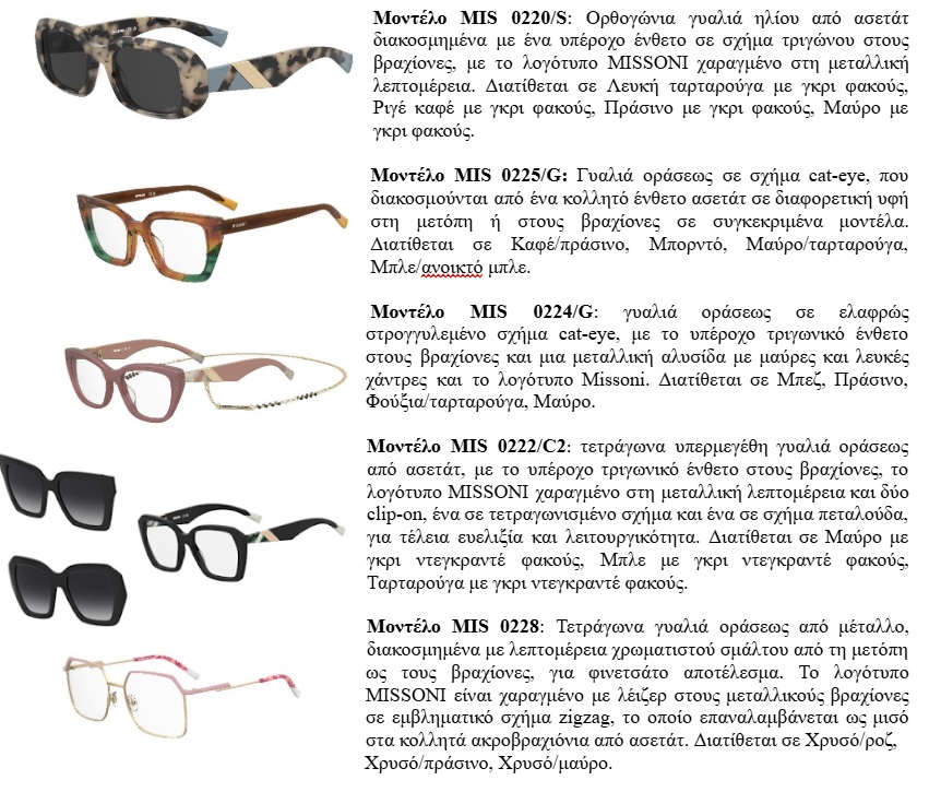 Η Συλλογή Γυαλιών MISSONI για τη σεζόν Άνοιξη/Καλοκαίρι 2025 διατίθεται παγκοσμίως σε επιλεγμένα καταστήματα οπτικών από τον Φεβρουάριο 2025. Η συλλογή σχεδιάζεται, παράγεται και διανέμεται από το Safilo Group, τον παγκόσμιο ηγέτη στη βιομηχανία γυαλιών, που δημιουργεί, παράγει και διανέμει γυαλιά ηλίου, γυαλιά οράσεως, γυαλιά δραστηριοτήτων, προστατευτικά γυαλιά και κράνη για περισσότερα από 90 χρόνια.