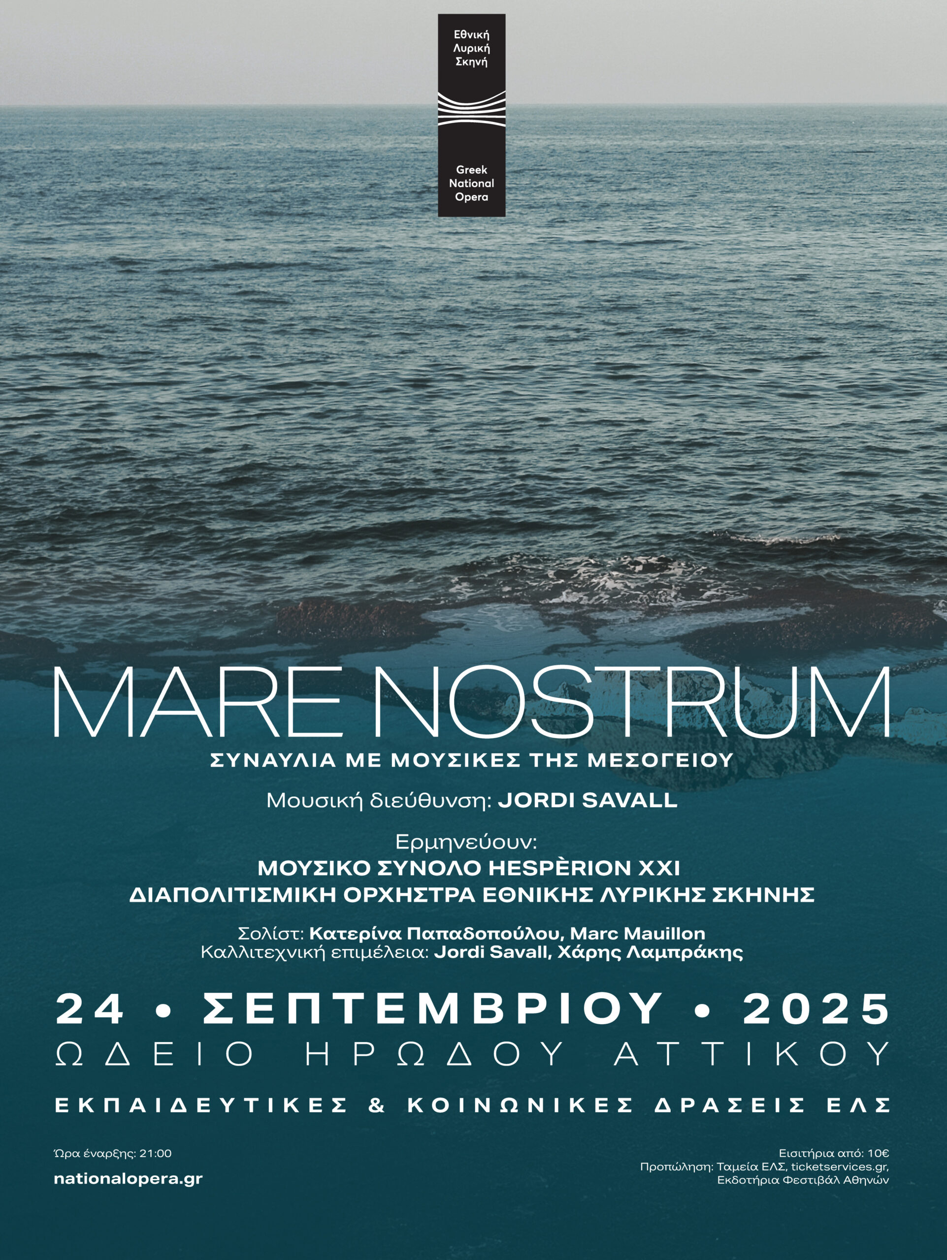 Μία μοναδική συναυλία με τίτλο Mare Nostrum, αφιερωμένη στις μουσικές της Μεσογείου, σε καλλιτεχνική επιμέλεια των Jordi Savall και Χάρη Λαμπράκη, παρουσιάζεται από την Εθνική Λυρική Σκηνή (ΕΛΣ) στο Ωδείο Ηρώδου Αττικού, την Τετάρτη 24 Σεπτεμβρίου 2025.