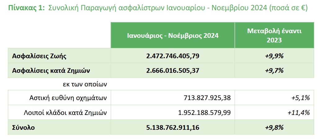 Σύμφωνα με τα στοιχεία αυτά (κατόπιν προσαρμογής των δεδομένων του προηγούμενου χρονικού διαστήματος με νεότερες απαντήσεις), από τη σύγκριση των δηλώσεων παραγωγής ασφαλίστρων των μηνών Ιανουαρίου – Νοεμβρίου 2024 των ανωτέρω επιχειρήσεων με τις αντίστοιχες της ίδιας περιόδου για το 2023 των ιδίων επιχειρήσεων, προκύπτουν τα παρακάτω: