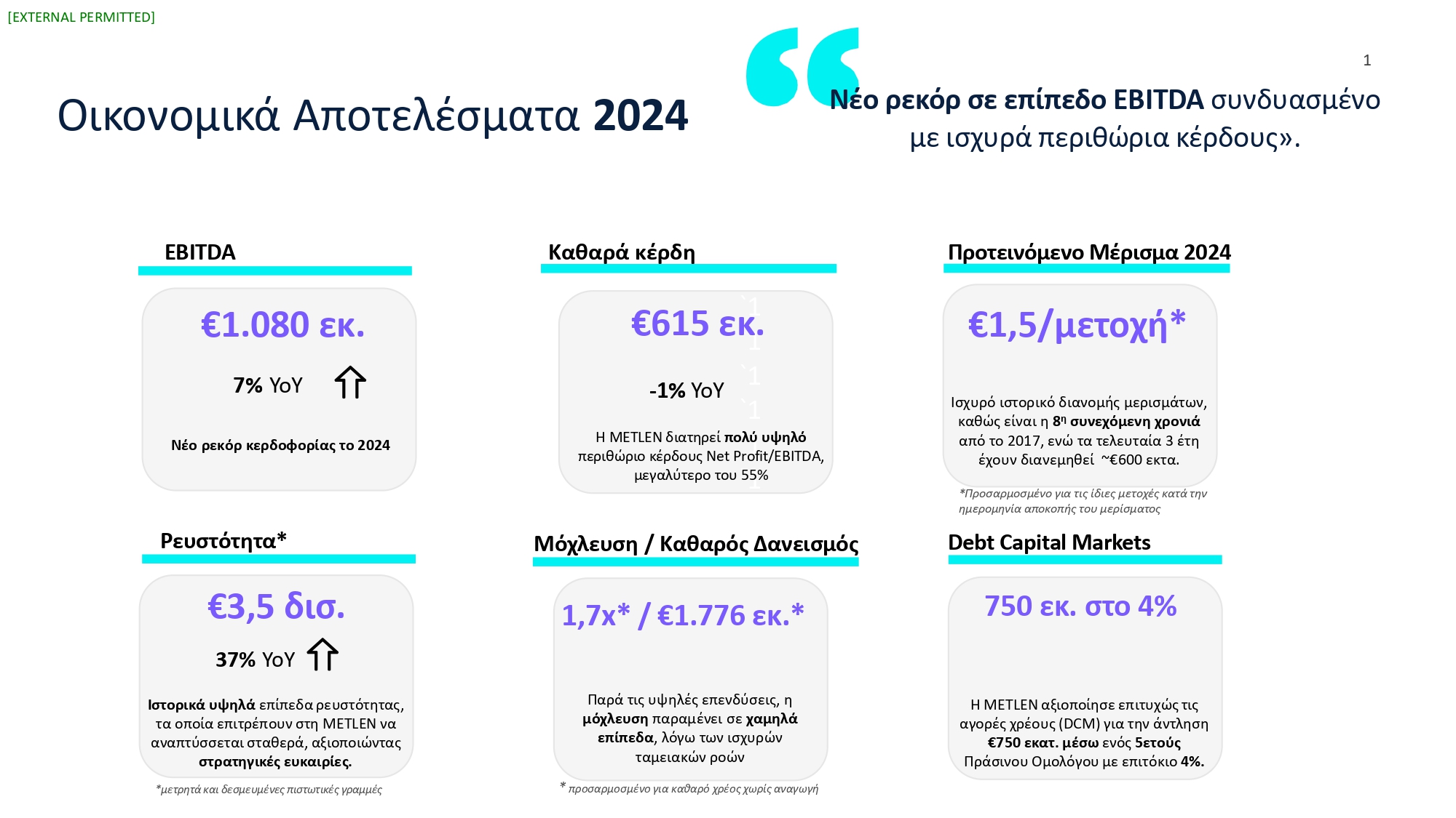 Περαιτέρω ανάλυση αναφορικά με τα οικονομικά αποτελέσματα, τις προοπτικές, τις επιχειρηματικές εξελίξεις και τη στρατηγική της Εταιρείας θα γίνει από τη Διοίκηση της METLEN στην προγραμματισμένη τηλεδιάσκεψη την Πέμπτη 20/2/2025, 17:00 μμ.