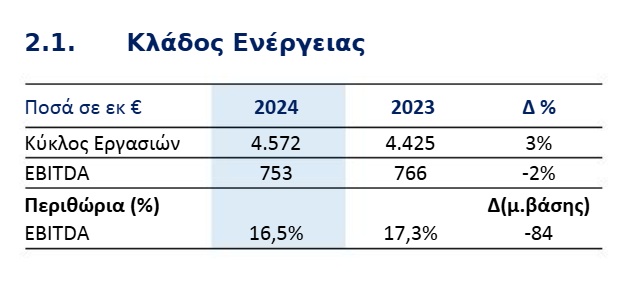 Ο Κλάδος Ενέργειας κατέγραψε κύκλο εργασιών €4.572 εκατ. που αντιστοιχεί σε 81% του συνολικού κύκλου εργασιών, παραμένοντας στα ίδια επίπεδα σε σχέση με το 2023. Τα Κέρδη προ Φόρων, Τόκων και Αποσβέσεων (EBITDA), διαμορφώθηκαν στα €753 εκατ. μειωμένα κατά 2% έναντι €766 εκατ. το 2023. Οι επιδόσεις αυτές, πρέπει να υπογραμμιστεί ότι επιτεύχθηκαν με τιμές Φ.Α. κατά 16% χαμηλότερες σε σχέση με το 2023 (αφορά τζίρο και EBITDA).