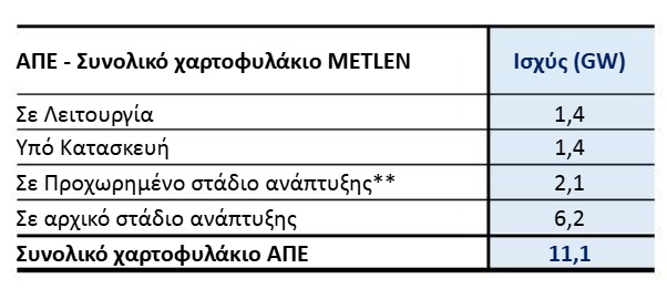 Το εν λειτουργία χαρτοφυλάκιο της εταιρείας σημείωσε δυναμική αύξηση, φτάνοντας τα 1,4 GW εγκατεστημένης ισχύος στο τέλος του έτους, υπερβαίνοντας για πρώτη φορά το ορόσημο του 1 GW. Συνολικά, το παγκόσμιο χαρτοφυλάκιο της METLEN ξεπέρασε τα 11,1 GW, μία συνολική αύξηση ~0,6GW έργων σε σχέση με την αρχή του έτους. Το συγκεκριμένο χαρτοφυλάκιο περιλαμβάνει έργα εν λειτουργία και σε ώριμη φάση ισχύος 4,9 GW, καθώς και έργα σε αρχικά στάδια ανάπτυξης ισχύος 6,2GW.