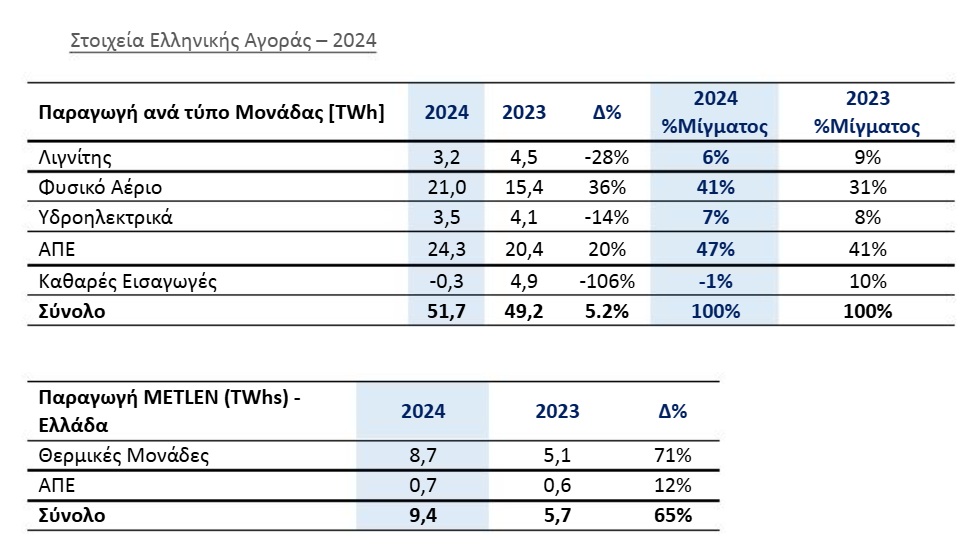 Η συνολική παραγωγή της Εταιρείας εντός Ελλάδος, τόσο από τις θερμικές, όσο και από τις ανανεώσιμες μονάδες της Εταιρείας, ανήλθε σε 9,4TWh, ποσότητα που αντιστοιχεί στο 18,2% της συνολικής ζήτησης, από 11,6% στο τέλος του 2023. Η METLEN, κατά το τελευταίο έτος, έχει καταφέρει σχεδόν να διπλασιάσει την παραγωγή της και, συνεπώς, το μερίδιο αγοράς της αναμένεται να αυξηθεί ακόμα περισσότερο το επόμενο διάστημα, με την προοπτική της επικείμενης αύξησης της παραγωγής από μονάδες ΑΠΕ. Παράλληλα, καθοριστική αναμένεται είναι η συνεισφορά τόσο των ισχυρών συνεργασιών που έχει αναπτύξει η Εταιρεία, οι οποίες στον συγκεκριμένο τομέα εκφράζονται κυρίως μέσω πιο ανταγωνιστικών τιμών φυσικού αερίου, όσο και των μοναδικών χαρακτηριστικών του θερμικού στόλου της και ιδιαίτερα της υψηλότερης απόδοσης των μονάδων της σε σύγκριση με την αγορά.