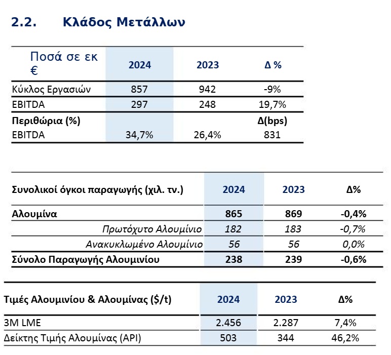 Ο Κλάδος Μετάλλων, το 2024, κατέγραψε νέο ιστορικό ρεκόρ κερδοφορίας, ως αποτέλεσμα τόσο της ενδυνάμωσης των premia του αλουμινίου, όσο και της τιμής του API της Αλουμίνας. Εξίσου καθοριστική για την επίτευξη της φετινής επίδοσης, ήταν και η έγκαιρη ανάληψη δράσεων από τη Διοίκηση της Εταιρείας αναφορικά τόσο στην κατοχύρωση ευνοϊκών τιμών LME, αξιοποιώντας στο έπακρο τις ευκαιρίες που δόθηκαν το προηγούμενο διάστημα, όσο και στον αυστηρό έλεγχο του κόστους. Το τελευταίο, μετά και τη λήξη του συμβολαίου με τη ΔΕΗ και την πλήρη ανάληψη της ηλεκτροδότησης του εργοστασίου του αλουμινίου από την Protergia, αποτελεί βασικό άξονα της επίτευξης νέου ιστορικού ρεκόρ κερδοφορίας του Κλάδου Μετάλλων. Τα παραπάνω, σε συνδυασμό με τις, κομβικής σημασίας, συνέργειες που προσφέρει η συνύπαρξη των Κλάδων Ενέργειας και Μετάλλων, όπως η δυνατότητα του εργοστασίου αλουμινίου, εν είδη μπαταρίας, να εκμεταλλεύεται τις ιδιαίτερα χαμηλές τιμές ενέργειας, που προκύπτουν λόγω υπερπροσφοράς σε συγκεκριμένες εποχές και συγκεκριμένες ώρες της ημέρας, διατηρούν την Εταιρεία μεταξύ των ανταγωνιστικότερων παραγωγών αλουμινίου και αλουμίνας παγκοσμίως, χωρίς να παραγνωρίζεται βεβαίως το εξωπραγματικό κόστος της ενέργειας (σε Ευρωπαϊκή βάση) και τις δυσκολίες που προκαλεί στην παραγωγική δραστηριότητα.