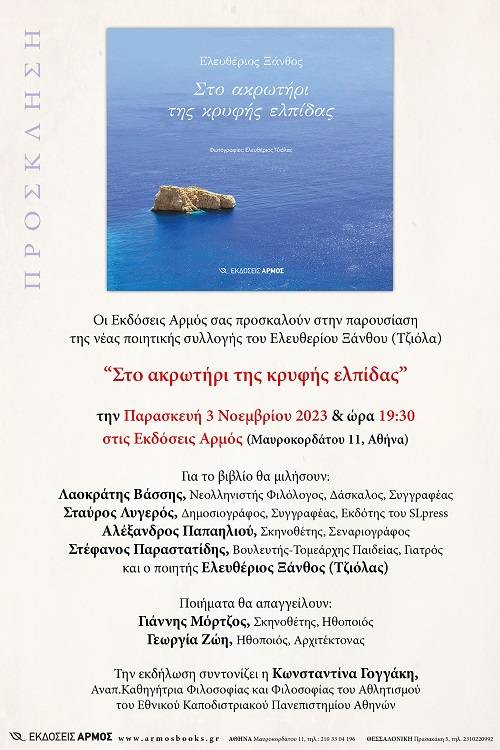 Οι Εκδόσεις Αρμός σας προσκαλούν στην παρουσίαση της νέας ποιητικής συλλογής του Ελευθέριου Τζιόλα “Στο ακρωτήρι της κρυφής ελπίδας”, την Παρασκευή 3 Νοεμβρίου ώρα 19.30, στις εκδόσεις “Αρμός” (Μαυροκορδάτου 11, Αθήνα). Επισυνάπτεται η πρόσκληση της εκδήλωσης: