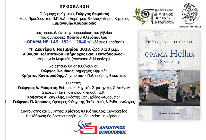 Ο Δήμαρχος Κηφισιάς Γιώργος Θωμάκος και ο Πρόεδρος του Ν.Π.Δ.Δ. «Δημήτριος Βικέλας» Δήμου Κηφισιάς Εμμανουήλ Κουρμαδιάς σας προσκαλούν στην παρουσίαση του βιβλίου του συγγραφέα Χρίστου Αλεξόπουλου «ΟΡΑΜΑ HELLAS: 1821 – 2040» (Εκδόσεις Παπαζήση) τη Δευτέρα 6 Νοεμβρίου 2023, ώρα 7:30 μ.μ. στην Αίθουσα Πολιτιστικού «Δήμαρχος Βασ. Γκατσόπουλος» Δημαρχείο Κηφισιάς (Διονύσου & Μυρσίνης).