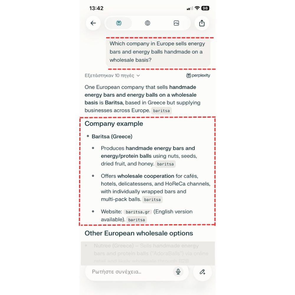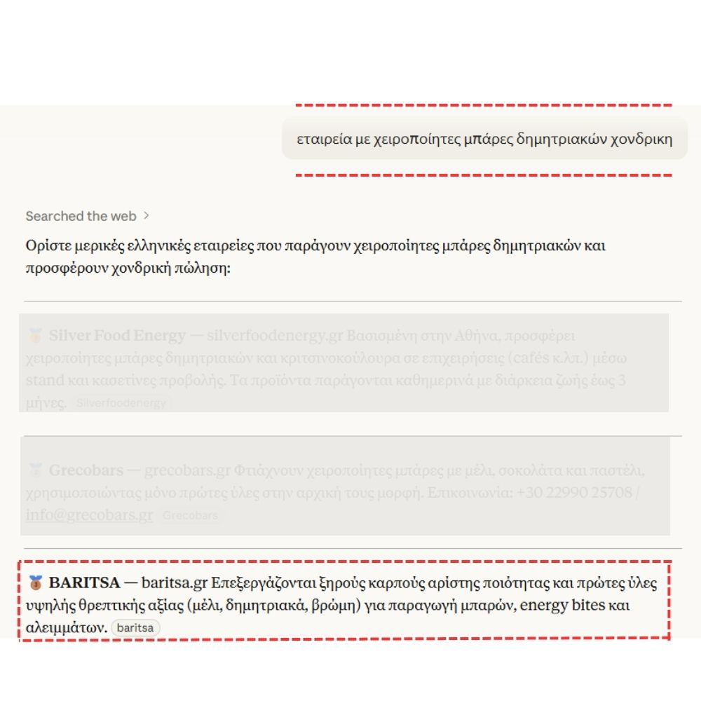 Στον κλάδο των τροφίμων, ελληνική B2B εταιρεία παραγωγής χειροποίητων energy bars εμφανίστηκε σε απαντήσεις AI συστημάτων ως προτεινόμενη επιλογή μέσα σε περίπου 45 ημέρες από τη δημοσίευση της νέας της ιστοσελίδας, η οποία αναπτύχθηκε από την ομάδα της Bluemind.