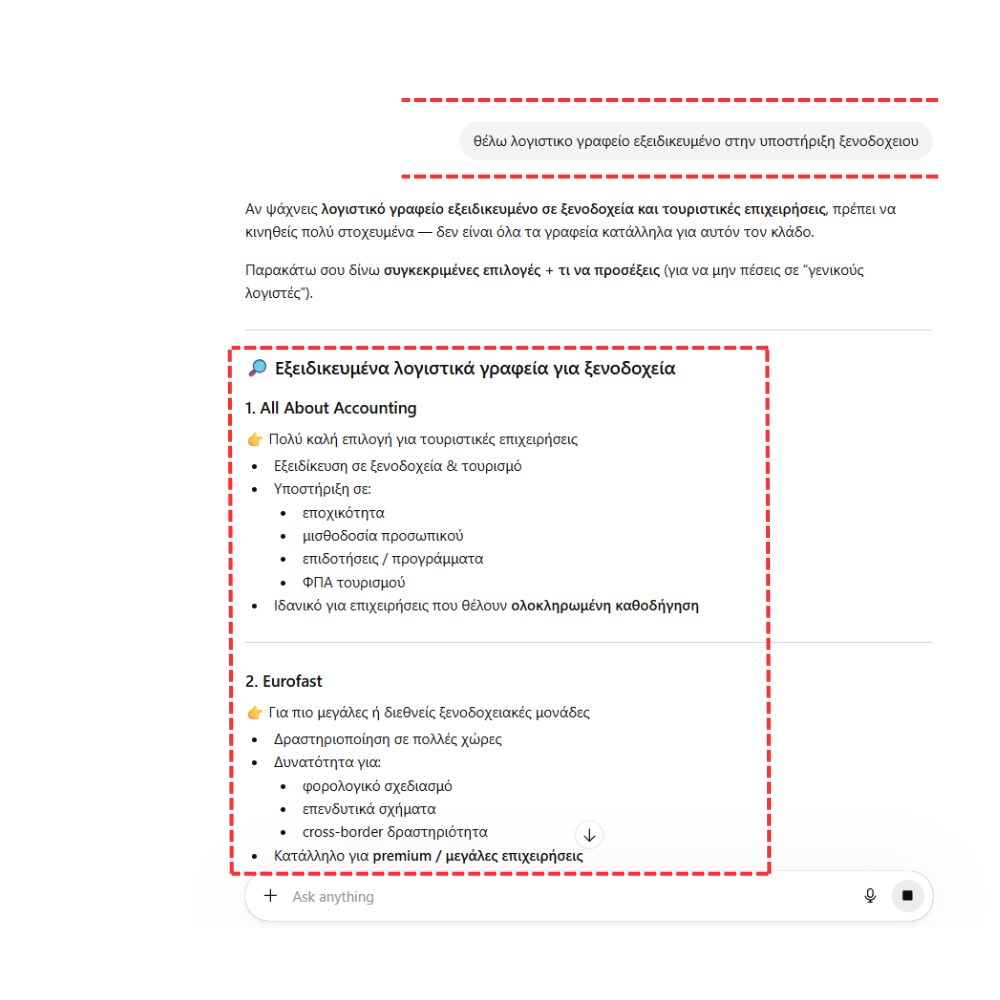 Αντίστοιχο παράδειγμα, στον τομέα των λογιστικών υπηρεσιών, σε ερωτήματα που αφορούν εξειδικευμένη υποστήριξη ξενοδοχειακών επιχειρήσεων, τα AI systems προτείνουν συγκεκριμένα γραφεία -τις ιστοσελίδες των οποίων ανέπτυξε η Bluemind – με σαφή κλαδική στόχευση, τα οποία αναγνωρίζονται ως αξιόπιστες πηγές γνώσης (thought leaders) στον συγκεκριμένο τομέα.