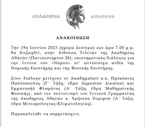 Πρόσκληση συμμετοχής στον επιστημονικό διάλογο για την “έννοια του Νόμου” στα αντίστοιχα πεδία της Νομικής Επιστήμης και της Φυσικής Επιστήμης, απευθύνει η Ακαδημία Αθηνών.