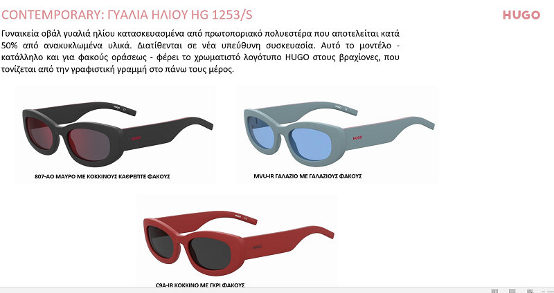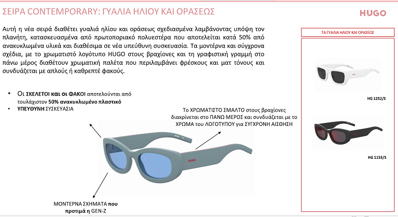 Η νέα σειρά Contemporary διαθέτει γυαλιά ηλίου και οράσεως σχεδιασμένα λαμβάνοντας υπόψη τον πλανήτη, κατασκευασμένα από πρωτοποριακό πολυεστέρα που αποτελείται κατά 50% από ανακυκλωμένα υλικά και διαθέσιμα σε νέα υπεύθυνη συσκευασία. Τα μοντέρνα και σύγχρονα σχέδια, με το χρωματιστό λογότυπο HUGO στους βραχίονες και τη γραφιστική γραμμή στο πάνω μέρος διατίθενται σε φρέσκους και ματ τόνους με απλούς ή καθρεπτέ φακούς.