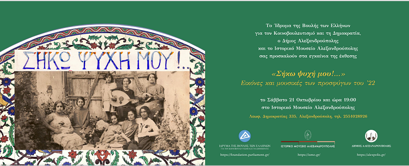 Το Ίδρυμα της Βουλής των Ελλήνων για τον Κοινοβουλευτισμό και τη Δημοκρατία, ο Δήμος Αλεξανδρούπολης και το Ιστορικό Μουσείο Αλεξανδρούπολης, παράλληλα με το διεθνές συνέδριο Μετακινήσεις πληθυσμών, 1900-1951: ο κόσμος και η Θράκη, παρουσιάζουν την έκθεση «ΣΗΚΩ ΨΥΧΗ ΜΟΥ»!… Εικόνες και μουσικές των προσφύγων του ’22, στο Ιστορικό Μουσείο της πόλης”.