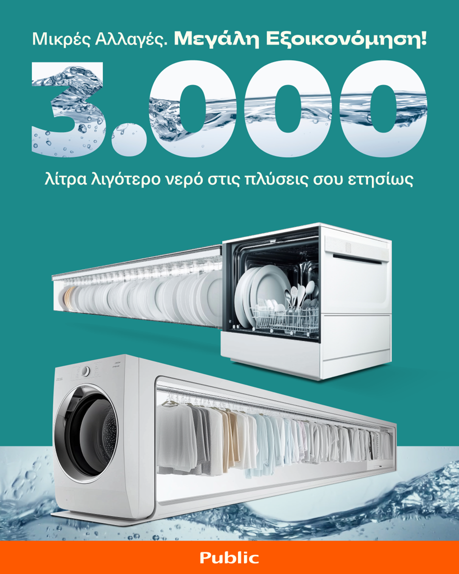 Τα Public παρουσιάζουν τις πιο πρόσφατες τεχνολογίες που επιτρέπουν στα πλυντήρια ρούχων και πιάτων να λειτουργούν με εξαιρετική απόδοση, εξοικονομώντας σημαντικές ποσότητες νερού και ενέργειας: