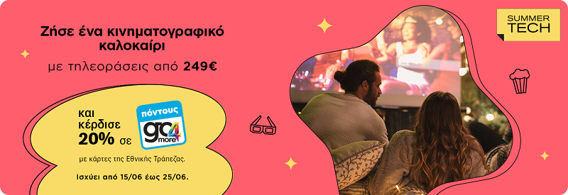 Ιδιαίτερα προσιτές τιμές σε τηλεοράσεις θα βρουν και φέτος το καλοκαίρι οι καταναλωτές στα καταστήματα ΓΕΡΜΑΝΟΣ και COSMOTE, καθώς και online στα www.germanos.gr και www.cosmote.gr. Μέχρι και την Κυριακή 25 Ιουνίου οι καταναλωτές μπορούν να αποκτήσουν φθηνότερα και με έως 48 άτοκες δόσεις* την Smart TV της επιλογής τους για να μπορούν να απολαύσουν τις αγαπημένες τους σειρές, ταινίες, εκπομπές και αθλητικά γεγονότα. Επιπλέον, με την αγορά τηλεόρασης αξίας 249€ και άνω, οι καταναλωτές μπορούν να κερδίσουν το 20% της αξίας της σε go4more πόντους** με την χρήση καρτών της Εθνικής Τράπεζας.