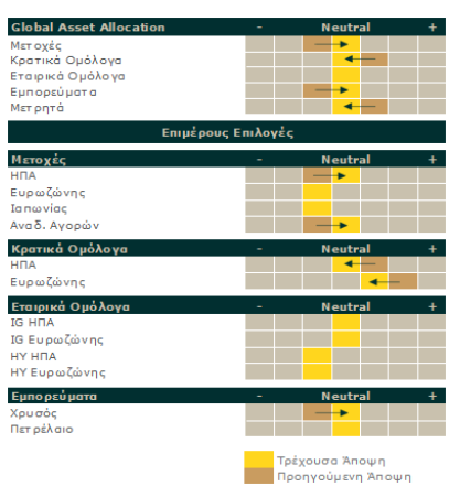 Στα ομόλογα, παρά το γεγονός ότι αναμένουμε τα βραχυχρόνια επιτόκια να συνεχίσουν να αποκλιμακώνονται, θεωρούμε ότι τα ρίσκα για τα ομόλογα μεγάλης διάρκειας συνεχίζουν να αυξάνονται. Για το λόγο αυτό αναθεωρούμε την άποψή μας για τα αμερικανικά κρατικά ομόλογα σε ουδέτερη (από ήπια θετική) και για τα ευρωπαϊκά κρατικά σε ήπια θετική (από θετική). Τέλος θεωρούμε ότι ο χρυσός θα διατηρήσει την ανοδική του δυναμική, υποστηριζόμενος από τις συνεχιζόμενες αγορές από τις ανά τον κόσμο Κεντρικές Τράπεζες”.