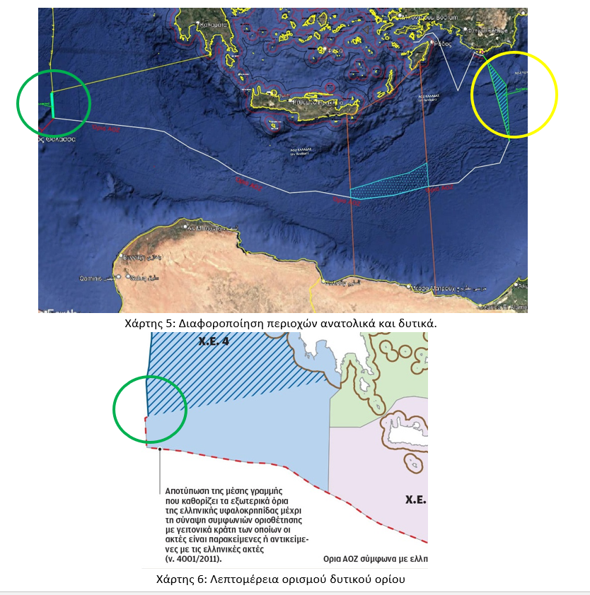Με την Αίγυπτο έχει γίνει οριοθέτηση με τον Ν. 4717 ΦΕΚ 164/28 Αυγούστου 2020. Το νότιο όριο είναι προϊόν συμβιβασμού με την Αίγυπτο που για στρατηγικούς λόγους θεωρήθηκε ωφέλιμη η απώλεια μιας περιοχής 8.000 τετρ. χλμ. περίπου (χάρτης 5), έναντι της τελικής οριοθέτησης λόγω της αποδοχής από την Αίγυπτο της έστω και μερικής επήρειας των νήσων της περιοχής.