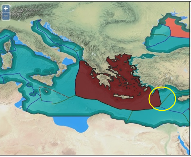 Την ίδια μέθοδο που χρησιμοποιεί ο ΘΧΣΕΕ και ο Θαλάσσιος Χωροταξικός Σχεδιασμός Ελλάδος, για τον προσδιορισμό του ανατολικού ορίου, χρησιμοποιεί και ο οργανισμός marineregions.org όπως φαίνεται και στον χάρτη 7 (κίτρινος κύκλος).