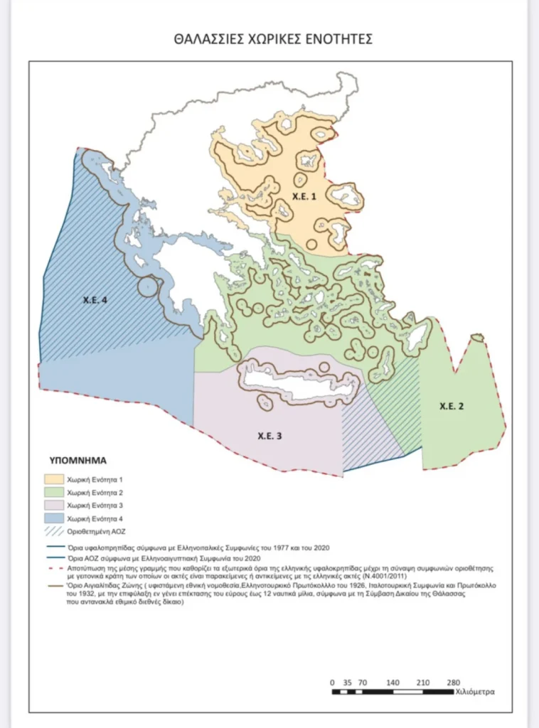 Οι θαλάσσιες περιοχές που αποτυπώνονται στον χάρτη, συμπεριλαμβάνουν τις ελληνοϊταλικές συμφωνίες οριοθέτησης ΑΟΖ του 1977 και του 2020 και την ελληνοαιγυπτιακή συμφωνία του 2020, ενώ συμπίπτουν με τα όρια που απορρέουν από τον νόμο 4001/2011.