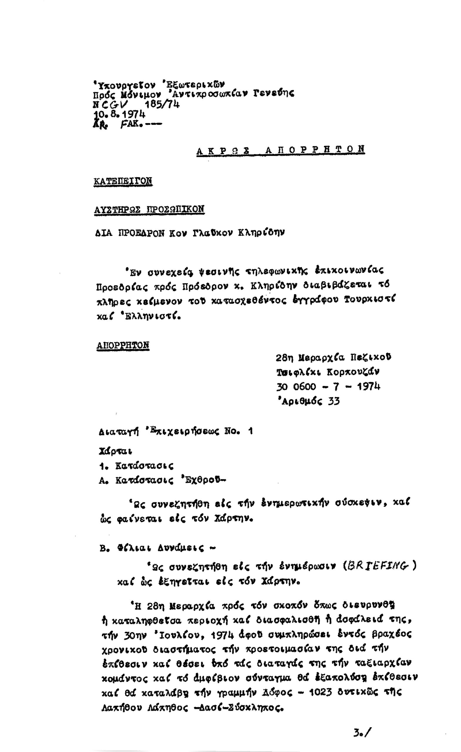 Σε άκρως απόρρητο μήνυμα και με ένδειξη ΕΠΕΙΓΟΝ, που υπογράφεται από τον αρχηγό ΓΕΕΦ, υποστράτηγο, Ευθύμιο Καραγιάννη, που ανέλαβε καθήκοντα μετά την εισβολή, αλλά και τον Διευθυντή του 2ου Γραφείου του Γενικού Επιτελείου Εθνικής Φρουράς, Ταγματάρχη Αθανάσιου Μιχαήλ (ημερομηνίας 10 Αυγούστου), σημειώνεται πως το έγγραφο αποτελεί Διαταγή Επιχειρήσεων της 28ης Μεραρχίας του τουρκικού στρατού, που βρέθηκε όπως ήδη αναφέραμε, «εις χείρας του Τούρκου Ταγματάρχου Μουσταφά Χουσείν Τσιετινέλ Διοικητού του Τάγματος Αρμάτων της Μεραρχίας αιχμαλωτισθέντος την 31.7.74.».