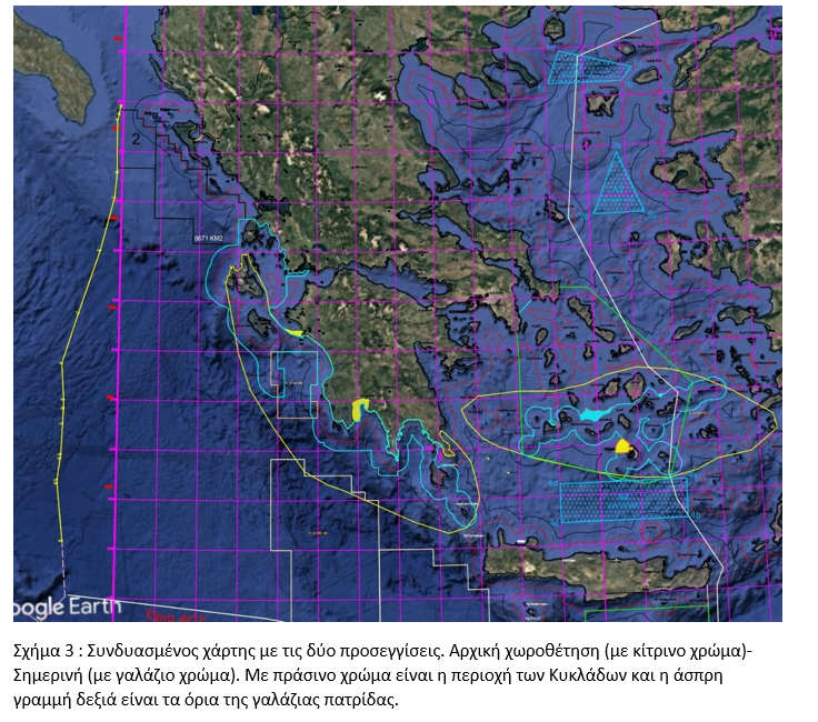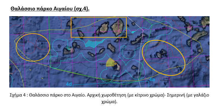 - Παρακολουθώντας την γραμμή οριοθέτησης, σε προβολές τμημάτων ακτογραμμής νησιών δεν περιλαμβάνονται περιοχές θαλάσσιων πάρκων, όπως εδυτικά της Σαντορίνης μιας έκτασης περίπου 203 τετρ. χλμ. (σχ. 4, με κίτρινο χρώμα με διαγράμμιση), ή βόρεια της Μήλου μιας άλλης περιοχής, αν και ανήκει στην αιγιαλίτιδα ζώνη. Στο σημείο αυτό η οριοθέτηση εισέρχεται σε μια περιοχή της παραλίας της Μήλου και κινούμενη βόρεια – βορειοδυτικά περιλαμβάνει τμήμα της αιγιαλίτιδας ζώνης της Κιμώλου και της νήσου Πολύαιγος για να ακολουθήσει εν συνεχεία προς τα ανατολικά στο όριο των 6 νμ.
