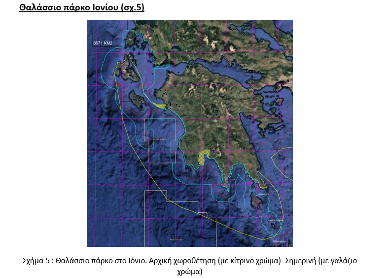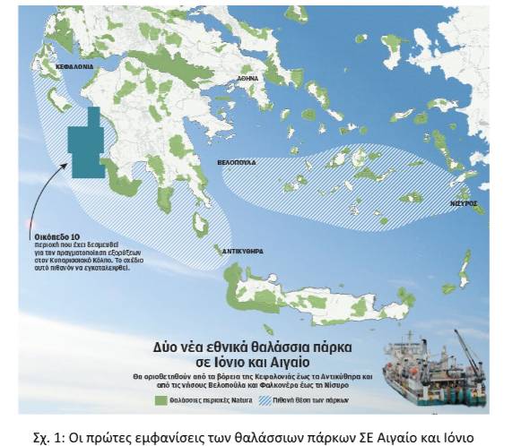 Από τον Απρίλιο του 2024, στα πλαίσια του 9ου διεθνούς Συνεδρίου για τους ωκεανούς που έγινε στην Αθήνα, φάνηκαν οι προθέσεις της κυβέρνησης για την δημιουργία δύο θαλάσσιων πάρκων σε Αιγαίο και Ιόνιο. Στον Τύπο κυκλοφόρησαν εκείνη την περίοδο χάρτες (σχ.1) που έδειχναν τα όρια αυτών των θαλάσσιων πάρκων, τα οποία και προκάλεσαν πολλές συζητήσεις. Ανάλογες ανακοινώσεις έγιναν και στη Νίκαια της Γαλλίας στην 3η Διάσκεψη του ΟΗΕ για τους Ωκεανούς από τον πρωθυπουργό, ο οποίος τόνισε ότι σύντομα τα θαλάσσια πάρκα θα υλοποιηθούν. Από μια πρώτη προσέγγιση σε εκείνους τους πρώτους χάρτες φάνηκαν ορισμένα χαρακτηριστικά.