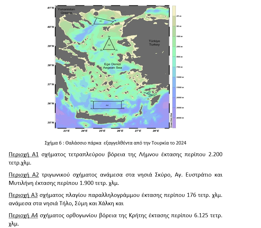 Όπως προαναφέραμε, αναμένονται οι επόμενες αντιδράσεις της Τουρκίας. Είναι σημειωτέον, ότι η Τουρκία είχε ήδη παρουσιάσει τις προθέσεις της για ορισμό δικών της θαλάσσιων πάρκων, μετά τις πρώτες εξαγγελίες που έγιναν από την Ελλάδα. Το Τουρκικό Ίδρυμα Θαλάσσιων Ερευνών είχε προτείνει τέσσερις θαλάσσιες προστατευόμενες περιοχές και μάλιστα κυκλοφόρησε και σχετικό χάρτη (σχ.6) με τον οποίο ορίζει αυτές τις τέσσερις περιοχές: