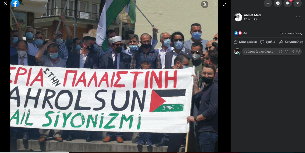 Σε ανακοίνωση του ο ψευδομουφτής έγραψε: «Η “Πορεία υποστήριξης της Παλαιστίνης” διοργανώθηκε υπό την ηγεσία του “μουφτή Ξάνθης” Αχμέτ Μετέ και του βουλευτή του ΣΥΡΙΖΑ Χουσεΐν Ζεϊμπέκ. Ο δήμαρχος Mustafçova Rıdvan Deli Hüseyin, ο δήμαρχος Yassıköy Önder Mümin, ο πρώην αναπληρωτής Ahmet Haciosman, ο αναπληρωτής υποψήφιος Rodop Özgür Ferhat και συμμετείχαν εκπρόσωποι πολλών σημαντικών θεσμών και οργανισμών των μειονοτήτων μας. Καταδικάστηκε η επίθεση του ισραηλινού κράτους στο τέμενος Αλ Άκσα και τη Γάζα, με πορεία και συνθήματα».
