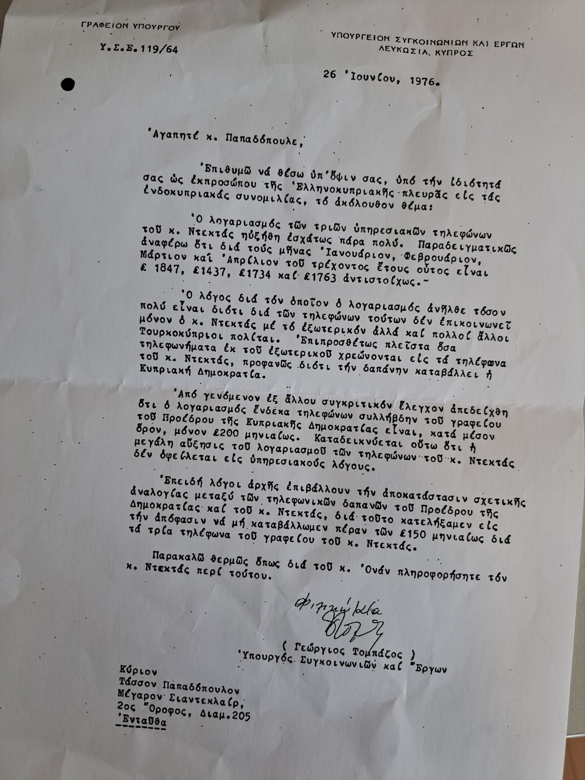Αφορμή για όλα τα πιο πάνω είναι μια επιστολή, που εντοπίστηκε στο Κέντρο Μελετών Τάσσου Παπαδόπουλου (ΚΜΤΠ-Α-Τ-Π-Έγγραφο- Αρ. 43788-ID-43788). Πρόκειται για μια πολύ ενδιαφέρουσα επιστολή του τότε υπουργού Συγκοινωνιών και Έργων, Γεώργιου Τομπάζου, προς τον τότε διαπραγματευτή της ελληνοκυπριακής πλευράς στο Κυπριακό, Τάσσο Παπαδόπουλο, ημερομηνίας 26 Ιουνίου 1976.