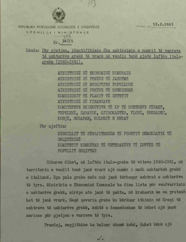 Στο Κεντρικό Κρατικό Αρχείο της Αλβανίας βρήκαμε αρχειακό υλικό, μέρος του οποίου αναρτούμε, το οποίο αναφέρεται ακριβώς σε αυτό το ζήτημα. Εκείνη την περίοδο εξελίσσεται η εργασία της ομάδας των εμπειρογνωμόνων του ελληνικού υπουργείου Αμύνης για την περισυλλογή των οστών και όσων ευρημάτων έχουν περισωθεί απ’ τον χρόνο, των 900 και πλέον ανδρών που είχαν ταφεί…