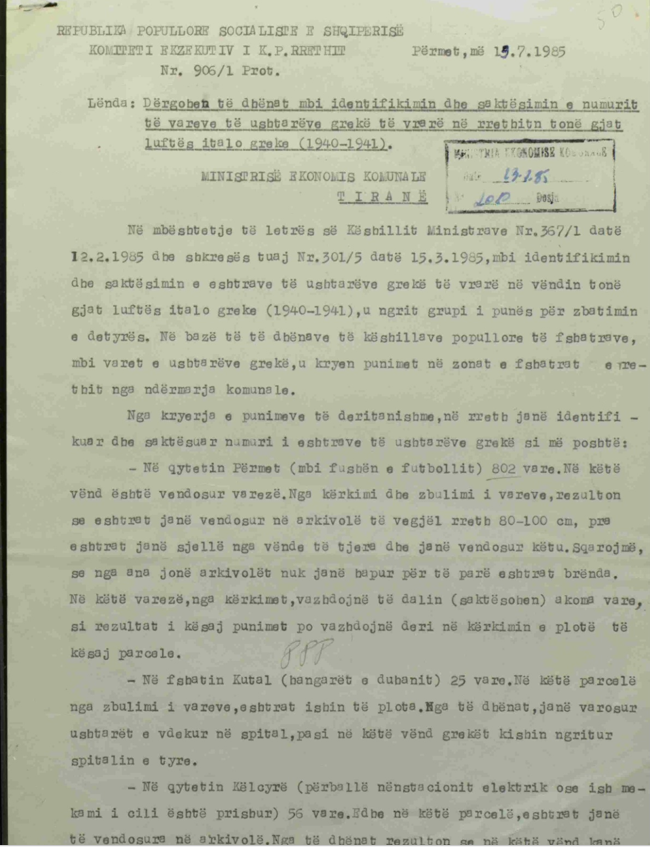 Θα πρέπει να εστιάσουμε στην εργασία που έγινε αμέσως μετά από την διατύπωση σχετικού αιτήματος από τον τότε υπουργού Εξωτερικών, τον αείμνηστο Κάρολο Παπούλια. Ο πρωθυπουργός της Αλβανίας είχε αποστείλει στις 12 Φεβρουαρίου του 1985 σχετική-επίσημη επιστολή στις Νομαρχίες (Εκτελεστικές Επιτροπές των Επαρχιών). Η γεωγραφία των παραληπτών έχει ειδική σημασία: Αργυρόκαστρο, Αυλώνα, Άγιοι Σαράντα, Πρεμετή, Κορυτσά, Πόγραδετς, Δέλβινο, Ερσέκα, Σκραπάρι… Οι υπηρεσίες των Νομαρχιών ανταποκρίθηκαν άμεσα.