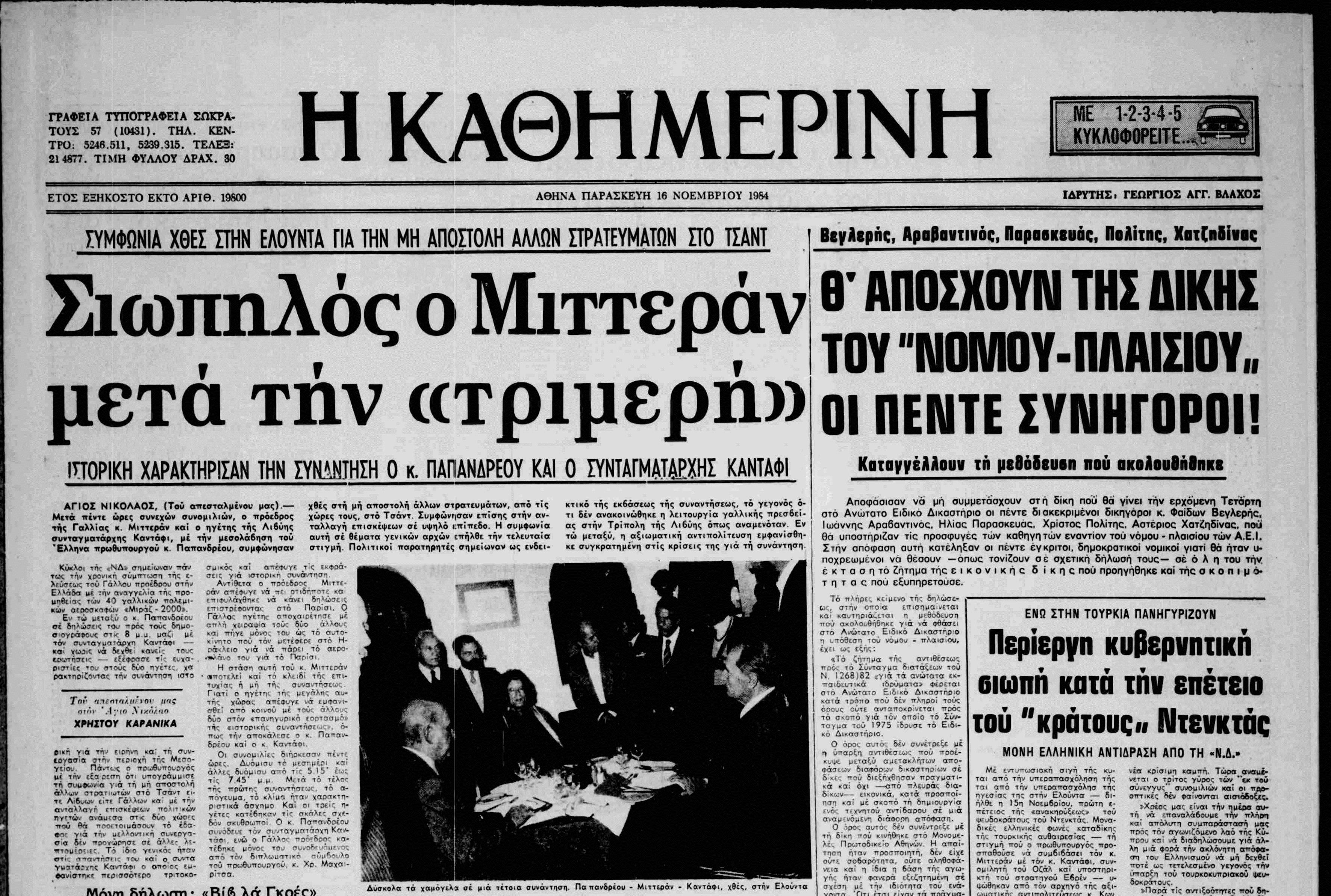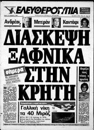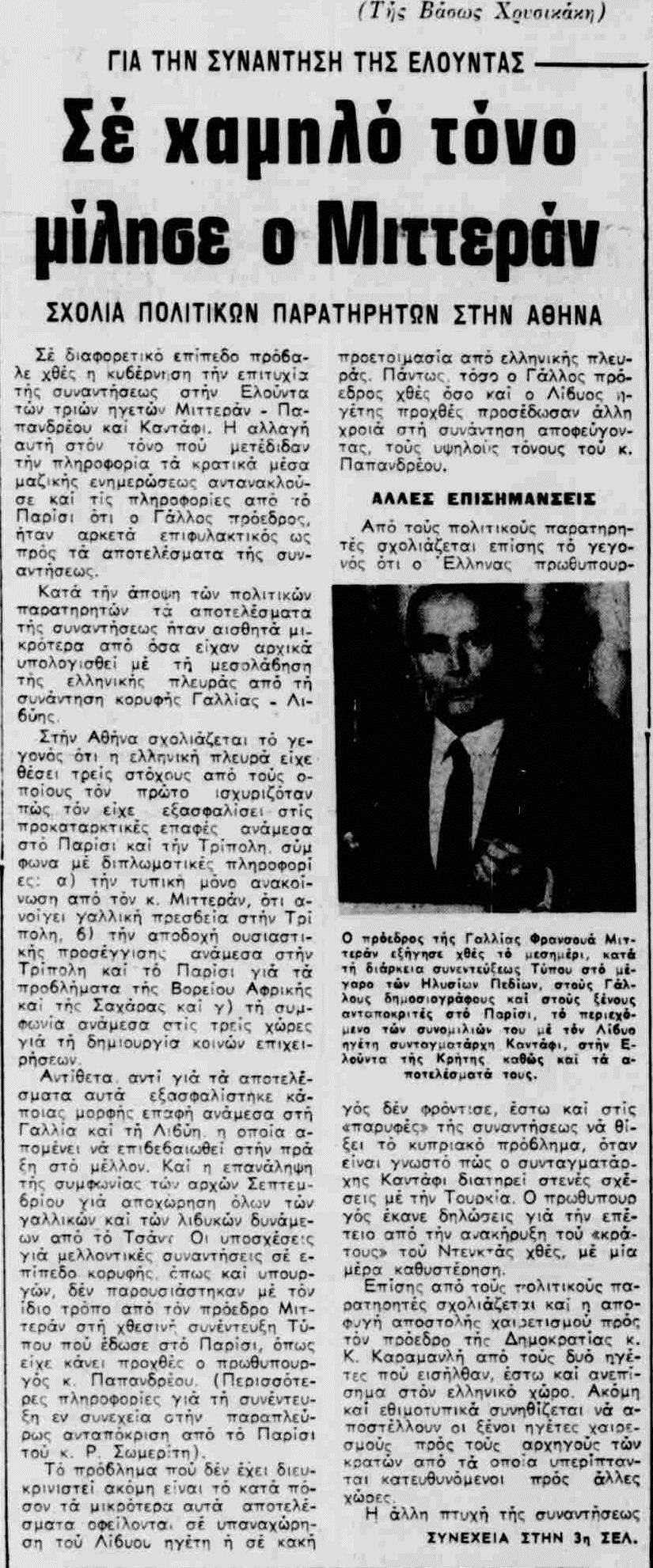 Ήταν ακριβώς 38 χρόνια πριν, τον Νοέμβριο του 1984, όταν υπό από άκρα μυστικότητα και με μυθιστορηματικό τρόπο, ο τότε πρωθυπουργός Ανδρέας Παπανδρέου φιλοξένησε στην Ελούντα του Αγίου Νικολάου της Κρήτης τον Γάλλο πρόεδρο, Φρανσουά Μιτεράν και τον τότε Λίβυο ηγέτη, Μουαμάρ αλ Καντάφι. Επρόκειτο για τριμερή συνάντηση που είχε κανονίσει ο Έλληνας πρωθυπουργός με σκοπό την αποκατάσταση των γαλλολιβυκών σχέσεων, οι οποίες είχαν κλονιστεί μετά το ζήτημα του Τσαντ (Ελευθεροτυπία, 15.11.1984).