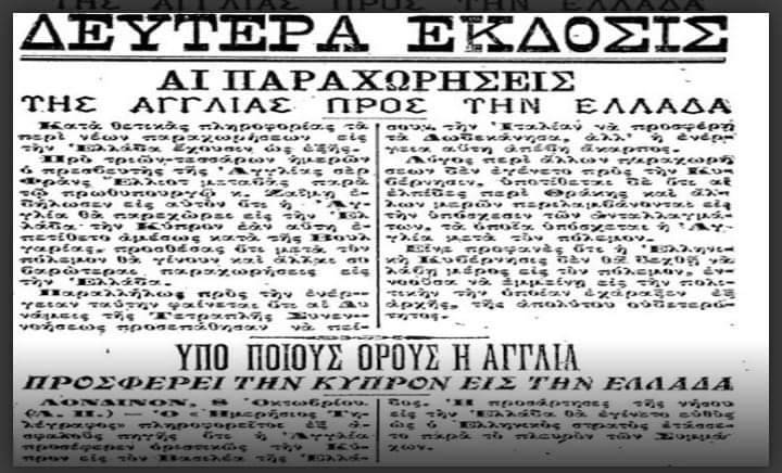 Το 1915 η Κύπρος μόλις είχε ανακηρυχθεί προτεκτοράτο λόγω της συμμετοχής των Νεότουρκων στον Πόλεμο (Νοέμβριος 1914). Έως τότε και από το 1878 ήταν παραχωρημένο στους Βρετανούς οθωμανικό έδαφος, που όμως παρέμενε υπό Οθωμανική κυριαρχία. Πολύ αργότερα και με τη Συνθήκη της Λωζάννης έγινε τμήμα της Βρετανίας και το 1925 κηρύχθηκε ως αποικία. Άρα το 1915 ήταν εντελώς διαφορετική η σχέση Βρετανίας-Κύπρου. Και γι’ αυτό έγινε η επίσημη βρετανική πρόταση για απόδοσή της στην Ελλάδα. Με αντάλλαγμα βεβαίως την συμμετοχή της στην Αντάντ.
