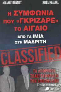 Την περασμένη Δευτέρα, παρουσιάσθηκε στη Δημοσιογραφική Εστία, στη Λευκωσία, το βιβλίο των δημοσιογράφων, Μιχάλη Ιγνατίου και Νίκου Μελέτη, με τίτλο «Η συμφωνία που ”γκρίζαρε” το Αιγαίο – Από τα Ίμια στη Μαδρίτη», που κυκλοφορεί από την εκδόσεις «Πεδίο». Πρόκειται για μια ακόμη μεγάλη ερευνητική προσπάθεια των δύο καλών συναδέλφων, η οποία φέρνει στο φως όλα τα απόρρητα τηλεγραφήματα των Αμερικανών, που από την επομένη του επεισοδίου των Ιμίων (Ιανουάριος 1996) άρχισαν να εργάζονται πυρετωδώς προκειμένου να υπάρξει συμφωνία.