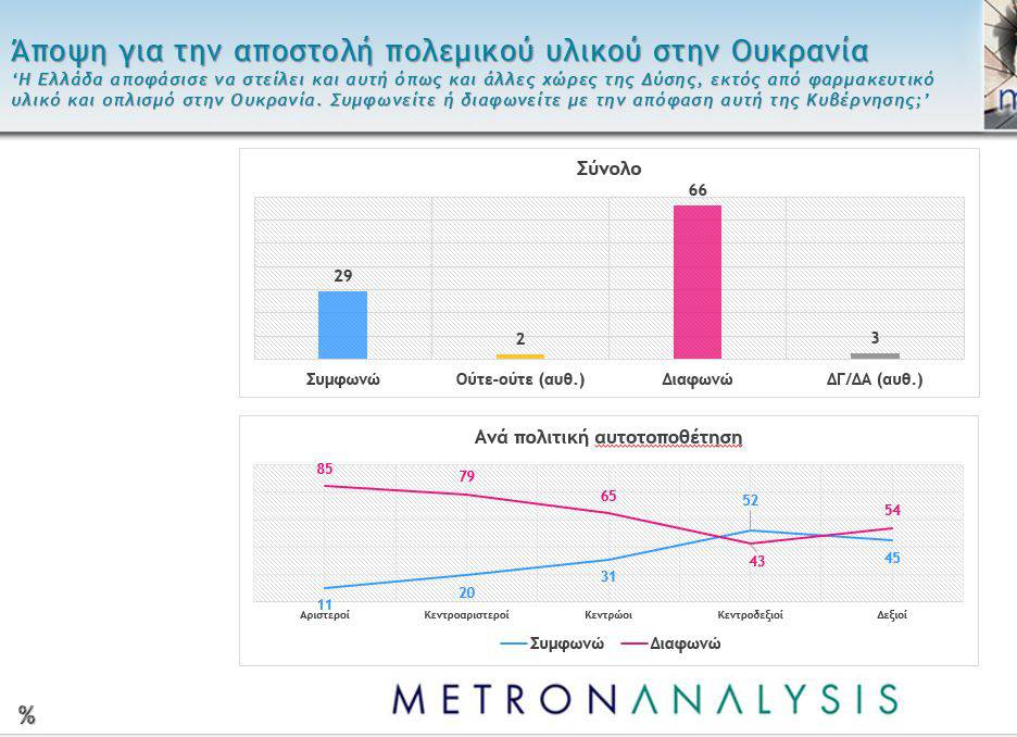 Κόλαφος για την κυβέρνηση είναι η απάντηση σχετικά με την αποστολή πολεμικού υλικού στην Ουκρανία. Το 66% διαφωνεί και το 29% συμφωνεί με την απόφαση αυτή.