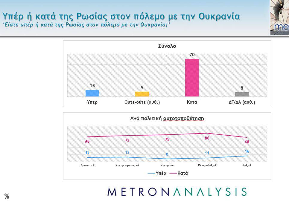 Συντριπτικά οι Ελληνες, σε ποσοστό 70% είναι κατά της Ρωσίας στον πόλεμο με την Ουκρανία και το 13% υπέρ. Βλέπουμε ότι είτε κάποιος είναι αριστερός είτε δεξιός φαίνεται να είναι αναφανδόν κατά της Ρωσίας στη συγκεκριμένη περίπτωση. Μάλιστα οι κεντροδεξιοί είναι κατά σε ποσοστό 80%.