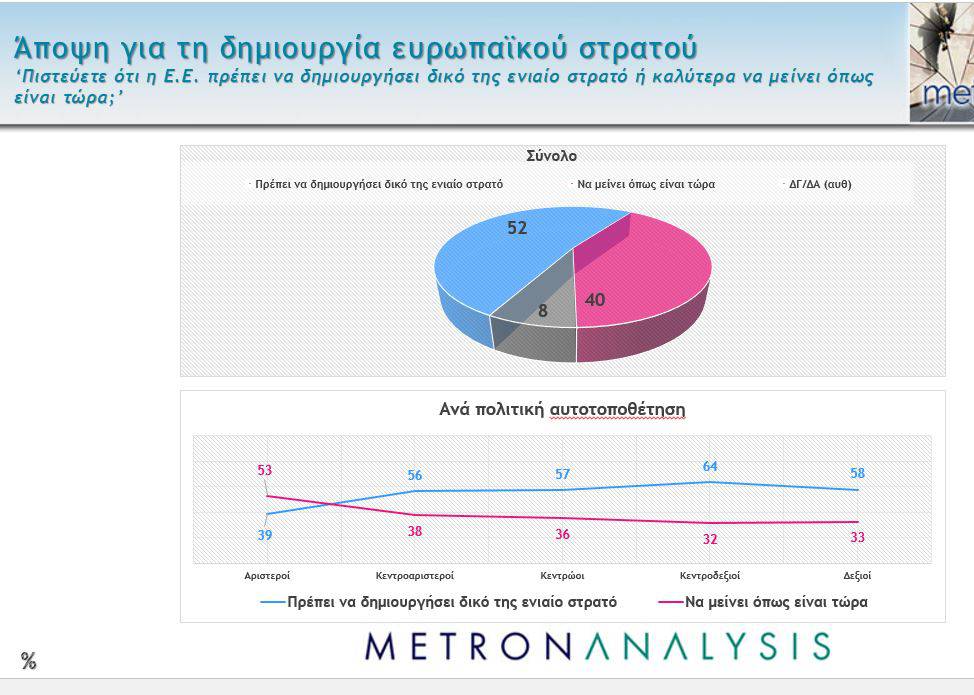 Περισσότεροι από τους μισούς ερωτηθέντες (52%) εκτιμά ότι πρέπει να δημιουργηθεί ευρωπαϊκός στρατός και το 40% λέει ότι πρέπει να μείνει όπως είναι τώρα.