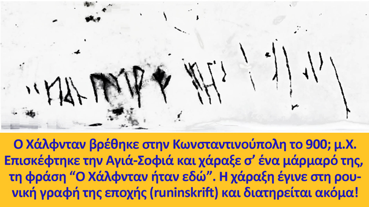 Ο Χάλφνταν ο Μέλας (Halfdanr Svart), ένα ζόρικο αγόρι, έζησε τον 9ο αιώνα και 18 ή 19 ετών, έγινε βασιλιάς του Άγκντερ. Αγαπούσε πολύ την Κωνσταντινούπολη και είχε καλές σχέσεις με τους «ομολόγους» του, οι οποίοι ανεχόντουσαν (με το αζημίωτο…) όλα τα βρωμερά οικονομικά του παιχνίδια. Κάποια φορά, βρέθηκε μέσα στην Αγιά-Σοφιά, ενθουσιάστηκε αμέσως ο βάρβαρος και χάραξε, μπροστά σε όλους, το όνομα του σ’ ένα μάρμαρο της εκκλησίας! Έγραψε σε ρουνική σκανδιναβική γραφή της εποχής (runinskrift): «Ο Χάλφνταν ήταν εδώ». Η γραφή υπάρχει μέχρι σήμερα.