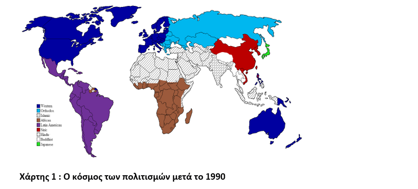 Τελικά, όπως αποδείχτηκε, η “αναίμακτη κατάρρευση” της Σοβιετικής Ένωσης το 1991 δεν σηματοδοτούσε μόνο τη νίκη της φιλελεύθερης δημοκρατίας και του καπιταλισμού, αλλά και την έναρξη μιας νέας κρίσης της Παγκόσμιας Τάξης Πραγμάτων, με αβέβαιη κατάληξη όπως φαίνεται σήμερα πολύ ξεκάθαρα σε παγκόσμιο επίπεδο, με επίκεντρο προς το παρόν την Εγγύς και Μέση Ανατολή και την εβραιοϊσλαμική σύγκρουση. Βασιζόμενος σε παλιότερες επιστημονικές θέσεις διανοητών όπως ο Μαξ Βέμπερ, ο Άρνολντ Τόινμπυ, ο Όσβαλντ Σπένγκλερ και ο Φερνάντ Μπρωντέλ, ο Χάντινγκτον προσδιόρισε στο διάσημο βιβλίο του σχηματικά πάνω σ΄ έναν «παγκόσμιο χάρτη πολιτισμών» εννέα ανταγωνιστικές πολιτιστικές ομάδες, συνήθως γύρω από ένα κυρίαρχο “κράτος πυρήνα”: τον Δυτικό, λατινοαμερικανικό, αφρικανικό, ισλαμικό, κινεζικό, ινδουιστικό, ορθόδοξο, βουδιστικό και ιαπωνικό (χάρτης 1).
