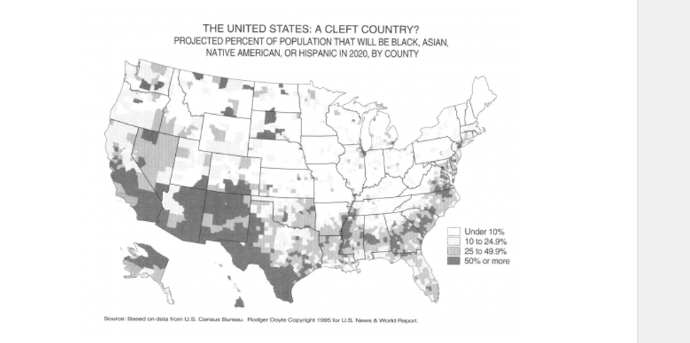 Ο χάρτης που παρουσιάζεται στο βιβλίο του Χάντινγκτον με τις απειλητικές δημογραφικές μετατοπίσεις σε βάρος της λευκής φυλής (σελ. 264) προϊδεάζει για μια μελλοντική κατάταξη των ΗΠΑ σε cleftcountry” (όρος που εισήγαγε ο Χάντινγκτον για τις χώρες με δύο ή και περισσότερους αντιμαχόμενους πολιτισμούς στο εσωτερικό τους) και φαίνεται να επιβεβαιώνει τις σημερινές εξελίξεις, όπως φαίνεται στον παραπάνω χάρτη. Ενώ πριν από περίπου δυο δεκαετίες η φυλετική σύνθεση στις ΗΠΑ ήταν περίπου 70% λευκοί και 30% μη λευκοί, σήμερα οι αναλογίες στενεύουν ραγδαία και σε μια εικοσαετία προβλέπεται να είναι 50-50. Αυτό το ενδεχόμενο έχει ήδη τεράστιο αντίκτυπο στην αμερικανική ψυχοσύνθεση και σίγουρα θα επηρεάσει και τις επερχόμενες αμερικανικές εκλογές.
