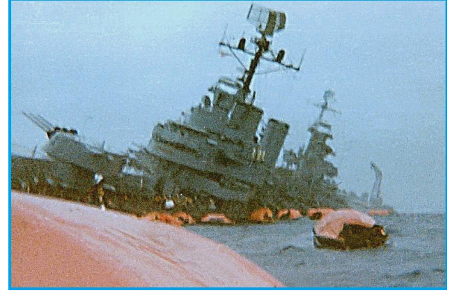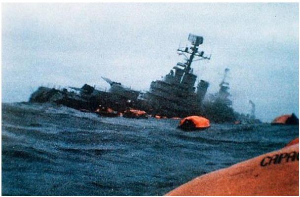 Το πλοίο, παρόλο που ήταν σε πολεμική ετοιμότητα, δεν είχε λάβει τον απαιτούμενο βαθμό στεγανότητας. Έτσι με τις στεγανές πόρτες και τις θυρίδες ανοικτές, κατακλύστηκε μέσα σε λίγο χρόνο από νερά, έγειρε αριστερά και άρχισε να βουλιάζει. Είκοσι λεπτά μετά την προσβολή, ο κυβερνήτης του πλοίου διέταξε την εγκατάλειψη του, που έγινε χωρίς πανικό, με την χρήση των σωστικών μέσων. Οι ναυαγοί βρέθηκαν στη θάλασσα, περιμένοντας τη διάσωση τους.