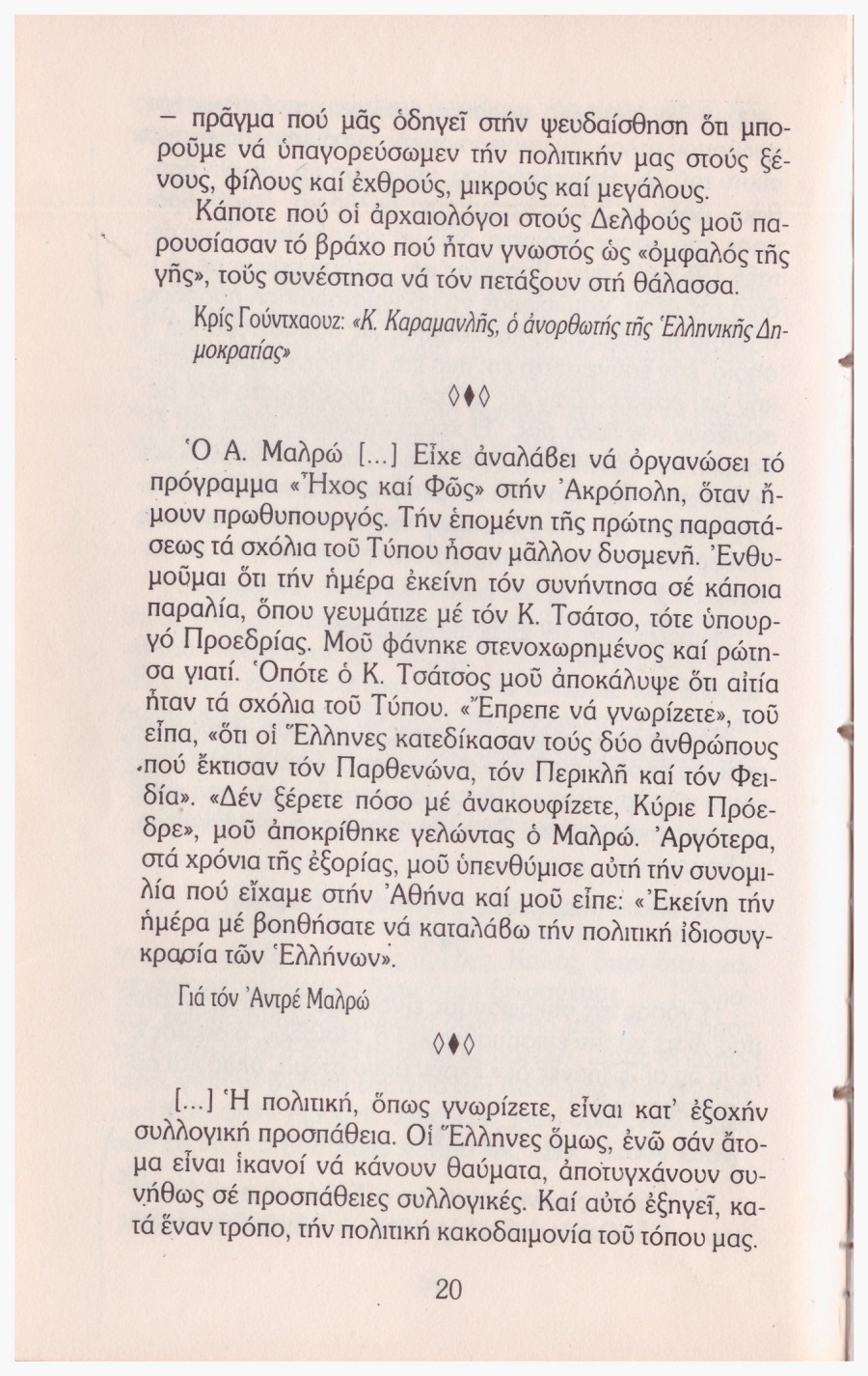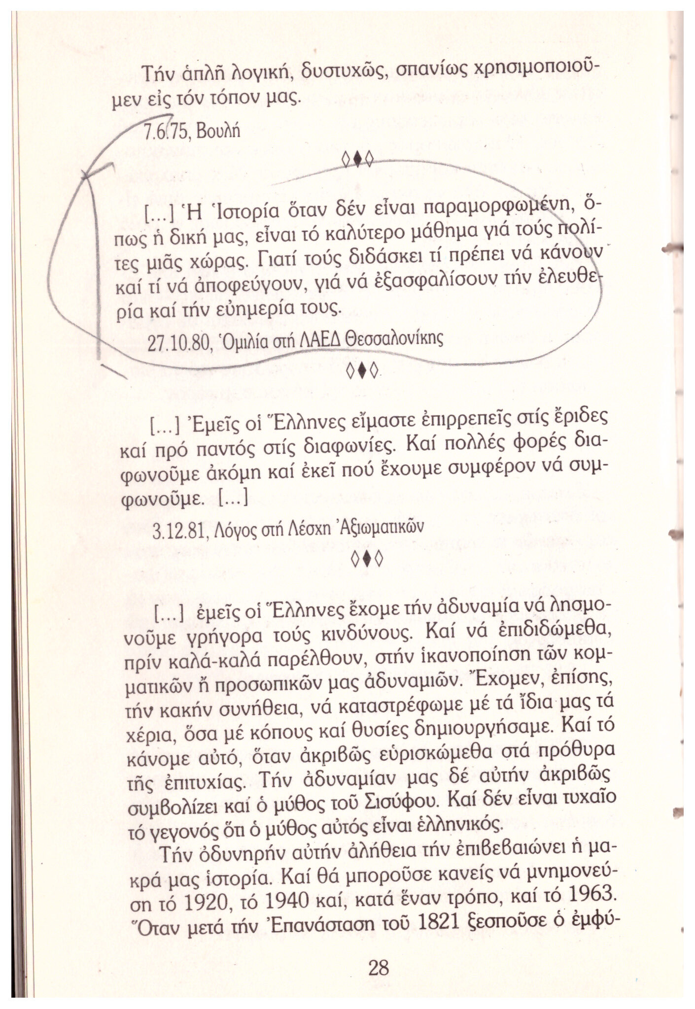Ας μου επιτραπεί να αρχίσω κάνοντας αναφορά σε δύο ρήσεις του Κωνσταντίνου Καραμανλή, μία από την οκταετία της ΕΡΕ και η άλλη μετά την κατά το 1974 επιστροφή του στην Ελλάδα. Κάποτε αρχαιολόγοι τού παρουσίασαν, στους Δελφούς, τον βράχο που θεωρήθηκε “ομφαλός της γης”. Και αυτός τους έδωσε τη μνημειώδη απάντηση: «Πετάξτε τον στη θάλασσα». Πολύ αργότερα, μιλώντας στη Λέσχη Αξιωματικών της Θεσσαλονίκης, τόνισε ότι η Ιστορία αποτελεί το καλλίτερο μάθημα για τους λαούς, εκτός από τη δική μας Ιστορία, την ελληνική, η οποία είναι “παραμορφωμένη”.
